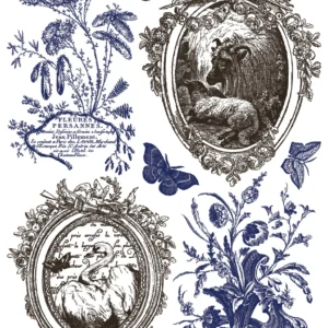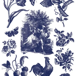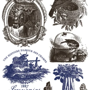 Soft distressing is intentionally built into the artwork, giving the designs a naturally aged feel from the very first use. A classic French palette of off-black, rich cobalt blue, and a deep plum-brown brings warmth and character, revealing subtle variation with each application. Thoughtfully scaled with a mix of full panels and coordinating elements, the imagery is designed to be used together on a single piece with ease.