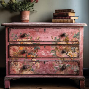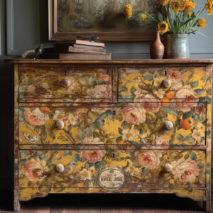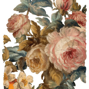 Designed for versatility, Joie Des Roses transforms large furniture pieces – think dressers, armoires, hutches, buffets – into artistic statements. It’s equally captivating on smaller items like lamps or ginger jar-style bases.
