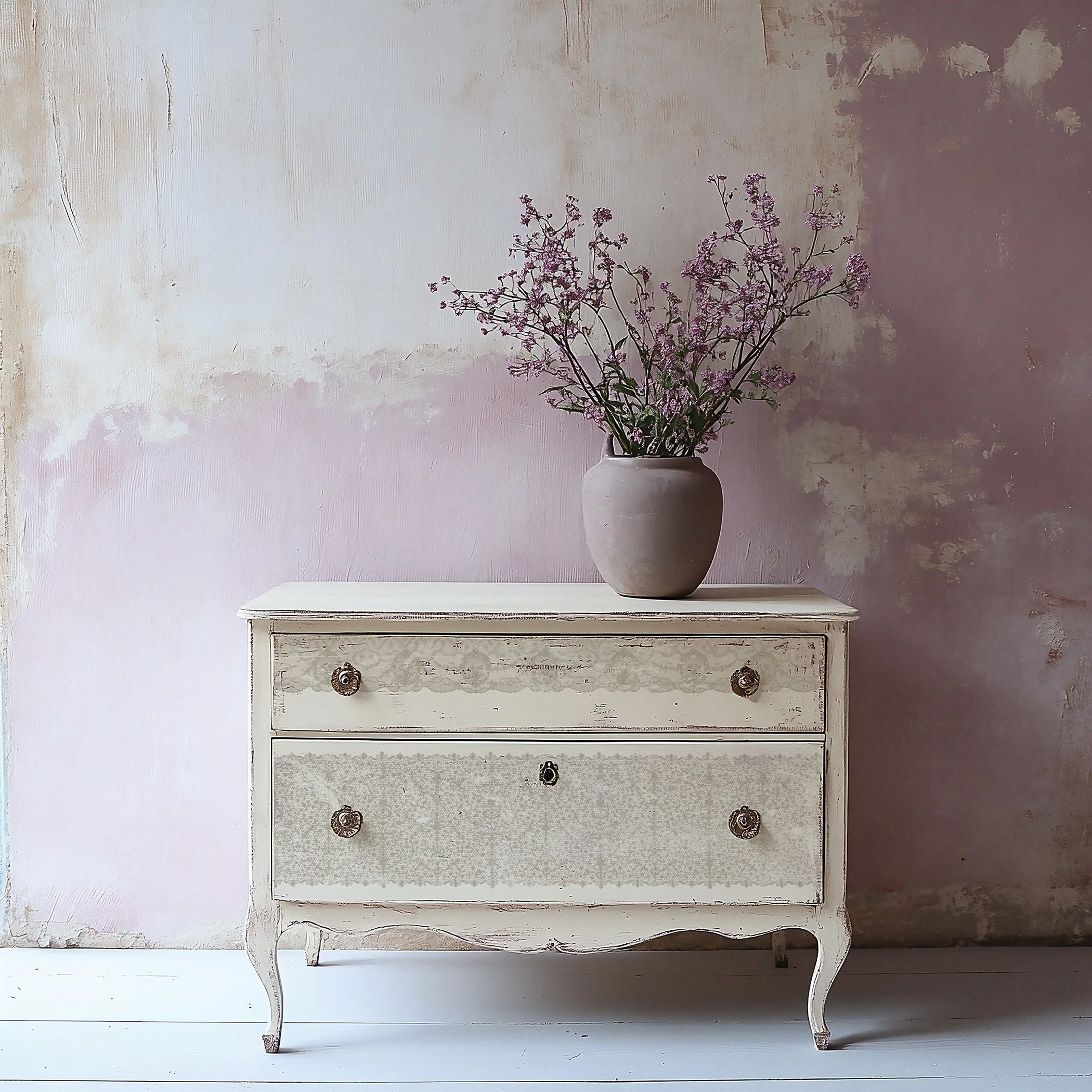 Crafted with intentional edges for seamless tiling, this stamp creates an effortless all-over lace pattern perfect for furniture, walls, and statement decor. With three distinct lace designs and scales included, it offers versatility for both large-scale projects and intricate mixed media work. Use it as a delicate repeating pattern or “tickle” the surface for subtle, crackle-like hints of vintage lace texture.