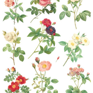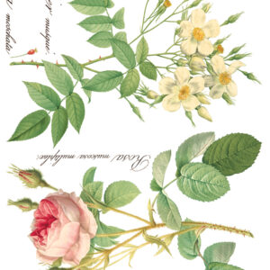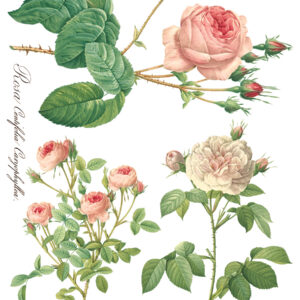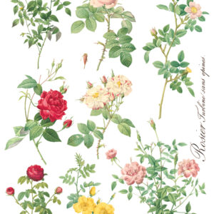 The Rose Botanical transfer set captures the intricate beauty of antique botanical illustrations. Each full-color sheet features a variety of rose species, rendered with exquisite detail and vibrant colors in the unmistakable style of Redouté.