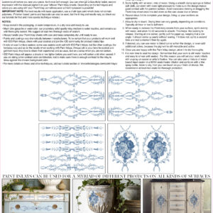 The Paint Inlay is a new innovative product. It is not a transfer nor a decoupage paper. Apply to your painted furniture or home decor. Each pad comes with 8 reusable pages. With each use the inlay becomes more faint and softens but renders a beautiful design appearing to be hand painted. There are no adhesives or ghosting shadows. Each pad comes with full detailed instructions on the back. For best results, we recommend using a chalk based paint without any polymers, such as Autentico Vintage. For use over blended painting techniques or stained wood we recommend Autentico Transfer Medium.